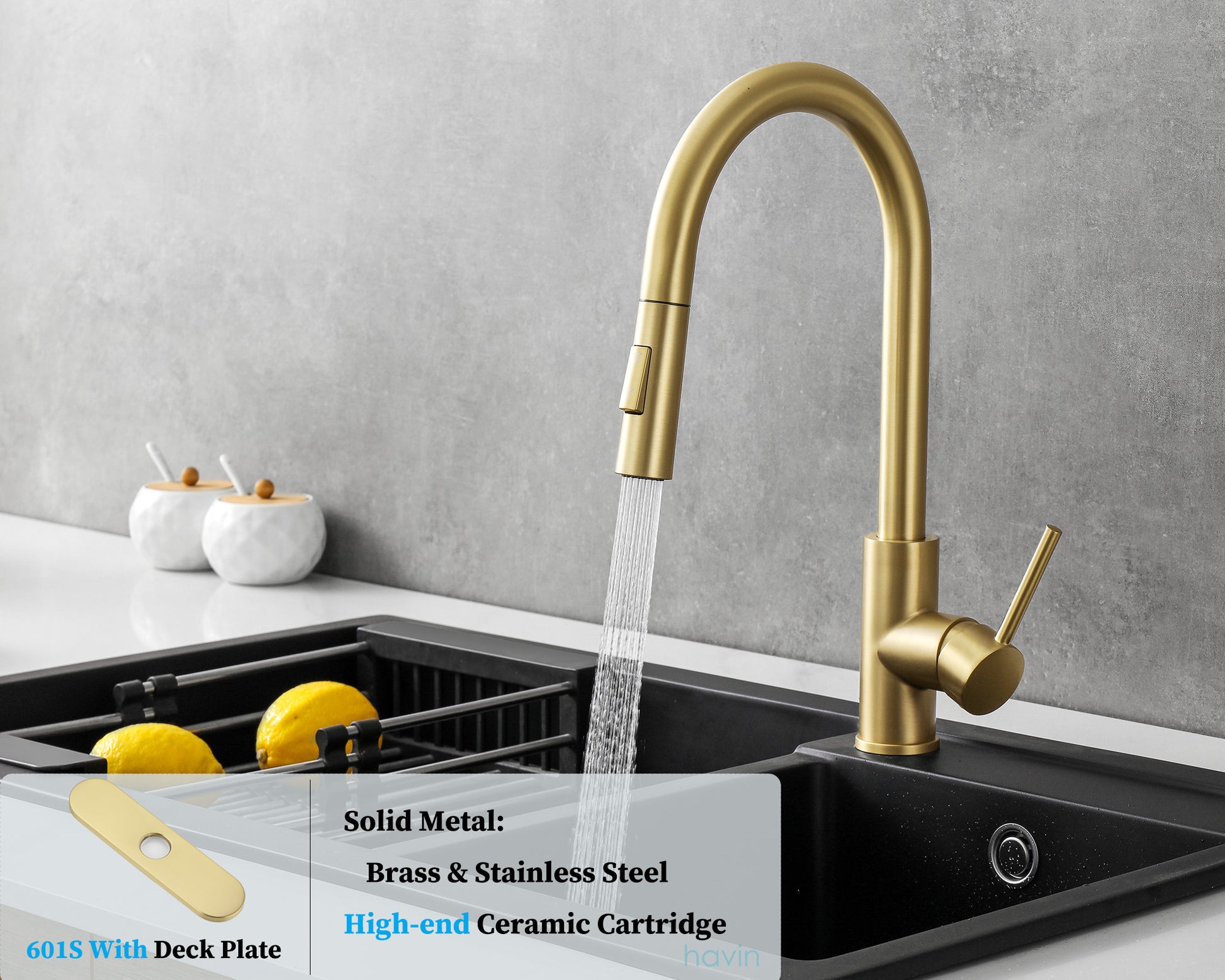 Havin HV601 Brass Kitchen Faucet with Pull Down Sprayer,Brushed Gold Color, Fit for 1 Hole and 3 Holes Deck Mount, Single Handle (Brushed Gold)