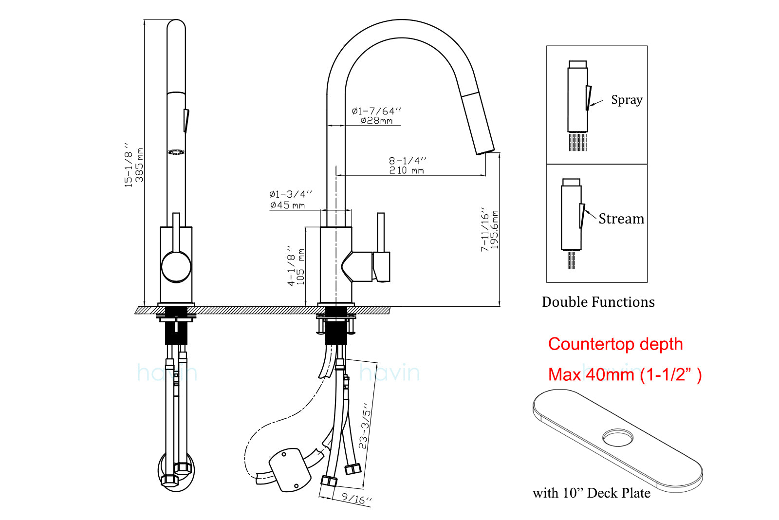 - ►►EASY TO INSTALL:The height is 15-1/8" , hole size require 1-3/8" (35mm) ,Fit for 1 and 3 Holes Kitchen Sink,Inculding 1pc Deck Plate 10-1/4"(Deck plate is a choice,spare part,if your sink is one hole,no need to use!) and 2pcs of 23-5/8" Cold&Hot Water Hoses (US Standard),NO Need Plumber and It Takes Only About 20-30 Minutes to Finish the DIY Installation with the Instruction Manual.